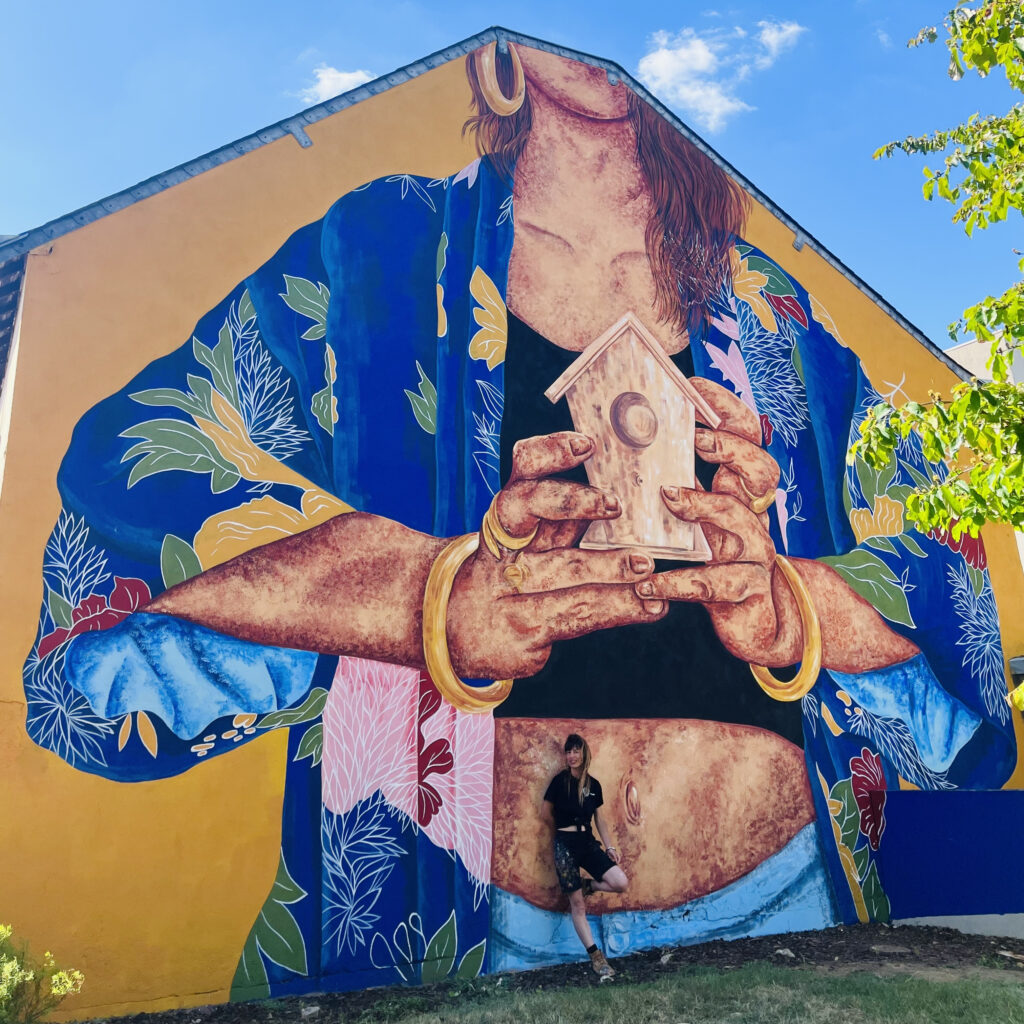 La figure humaine au centre de l’oeuvre, portant un nichoir, évoque la responsabilité que nous avons envers les êtres vivants qui partagent notre planète. Ce message résonne particulièrement ici, dans cette école, où une autre fresque a été réalisée l’année passée avec les enfants. Cette précédente création symbolisait la nature vue à travers les yeux des plus jeunes: colorée, vivante, et pleine de promesses. En prenant soin des espaces verts, et en transmettant ces valeurs aux générations futures, nous faisons tous un pas vers un monde plus harmonieux et respectueux de la nature.